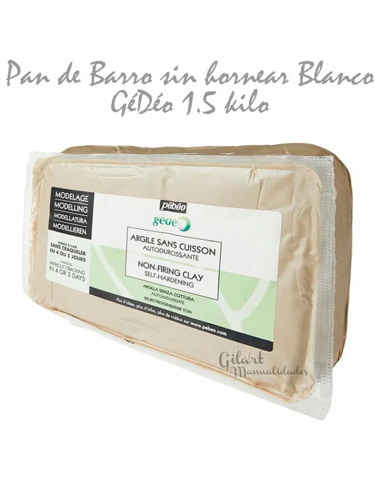 Arcilla Blanca Sin Cocción Gédéo Pébéo de 1,5 kg lista para usar. Ofrece un secado al aire uniforme y sin grietas, logrando un acabado fino apto para ser pintado o barnizado. Su textura suave y maleable es ideal para escultura, modelado y proyectos creativos que requieren un nivel de detalle profesional sin necesidad de horneado.