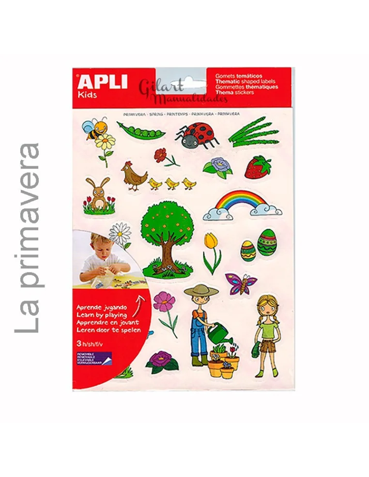 Gomets Temáticos La Primavera APLI 3 hojas 66 unidades. Diseñados con educadores para identificar objetos y conceptos primaverales. Ilustraciones divertidas que enriquecen vocabulario y estimulan motricidad con adhesivo removible. ¡Aprendizaje natural hoy!