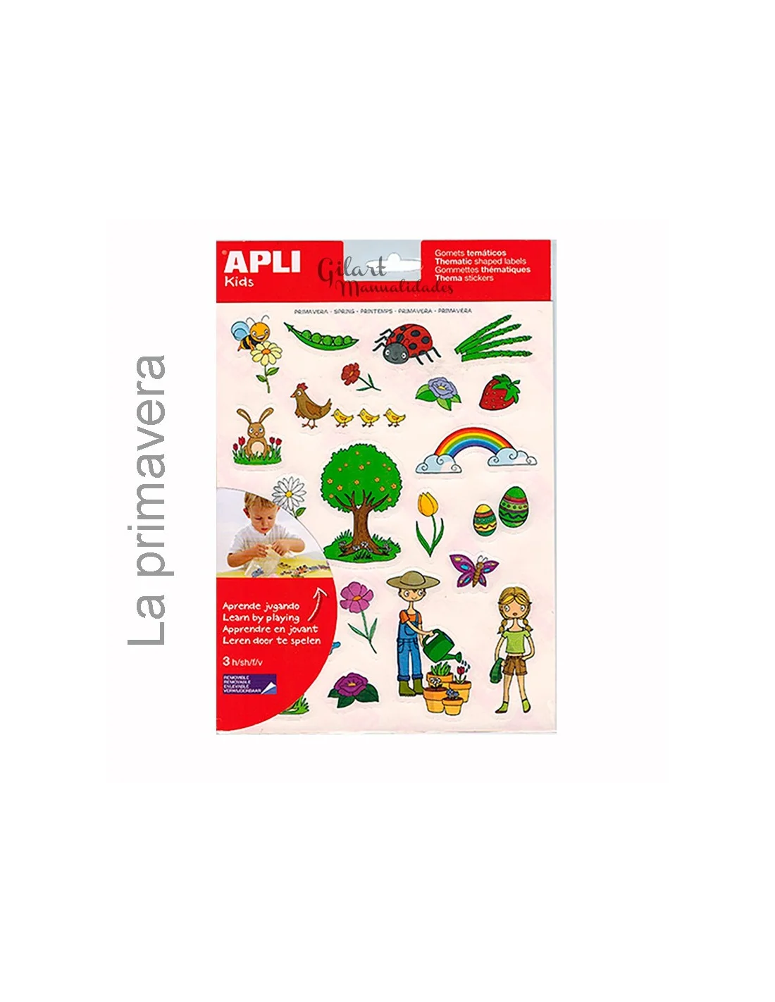 Gomets Temáticos La Primavera APLI Set 3 hojas 66 unidades. Herramienta lúdica y educativa para que los niños aprendan sobre la estación primaveral de forma divertida y significativa. Cada hoja contiene adhesivos con motivos florales, animales y elementos naturales típicos de la primavera, fomentando el desarrollo del vocabulario y la motricidad fina en cada colocación. Gracias a su adhesivo removible, se pueden corregir errores sin frustración, estimulando la experimentación libre y la creatividad. Elaborados con materiales reciclables, sin disolventes y con base agua, cumplen con los estándares de seguridad EN-71 y FSC garantizando productos seguros y respetuosos con el medio ambiente. Diseñados junto a educadores para máximo valor pedagógico en actividades escolares, talleres y momentos creativos en casa. Las ilustraciones coloridas captan la atención de los más pequeños mientras aprenden sobre ciclos naturales, plantas y animales de forma interactiva. Perfectos para crear escenas primaverales, juegos de clasificación o actividades de expresión artística. Experimenta la magia de la primavera y potencia el aprendizaje transformando cada momento de juego en una oportunidad educativa. ¡Descubre la naturaleza hoy mismo! 🏡