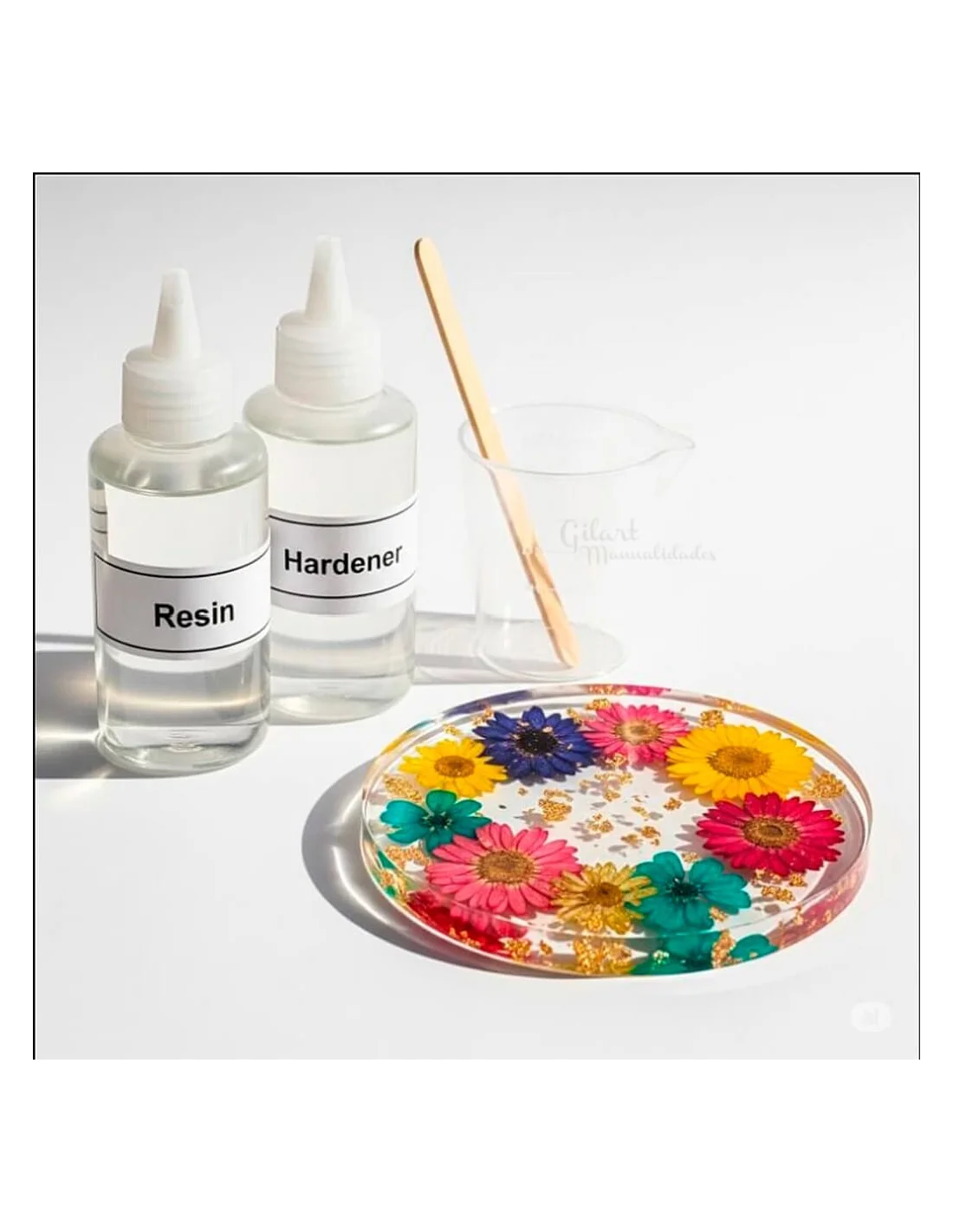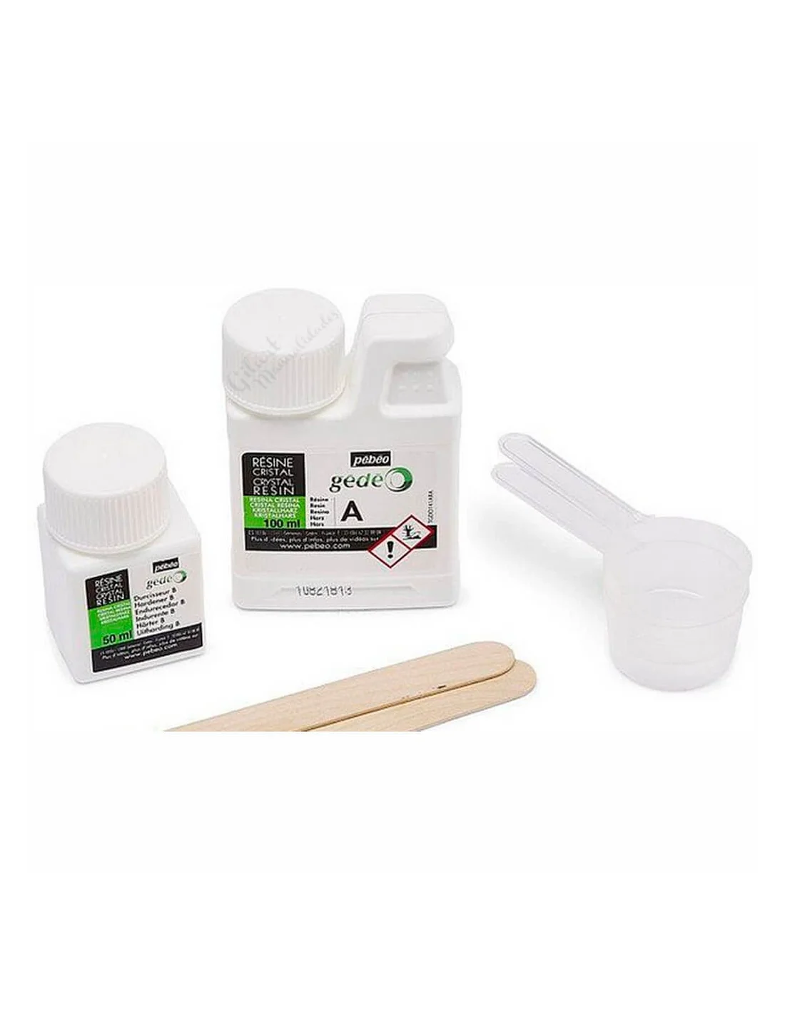 Botes de resina A y endurecedor B con accesorios de mezcla del kit Pebeo Gedeo.