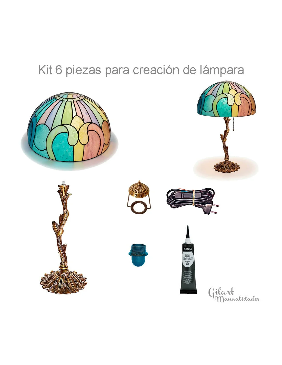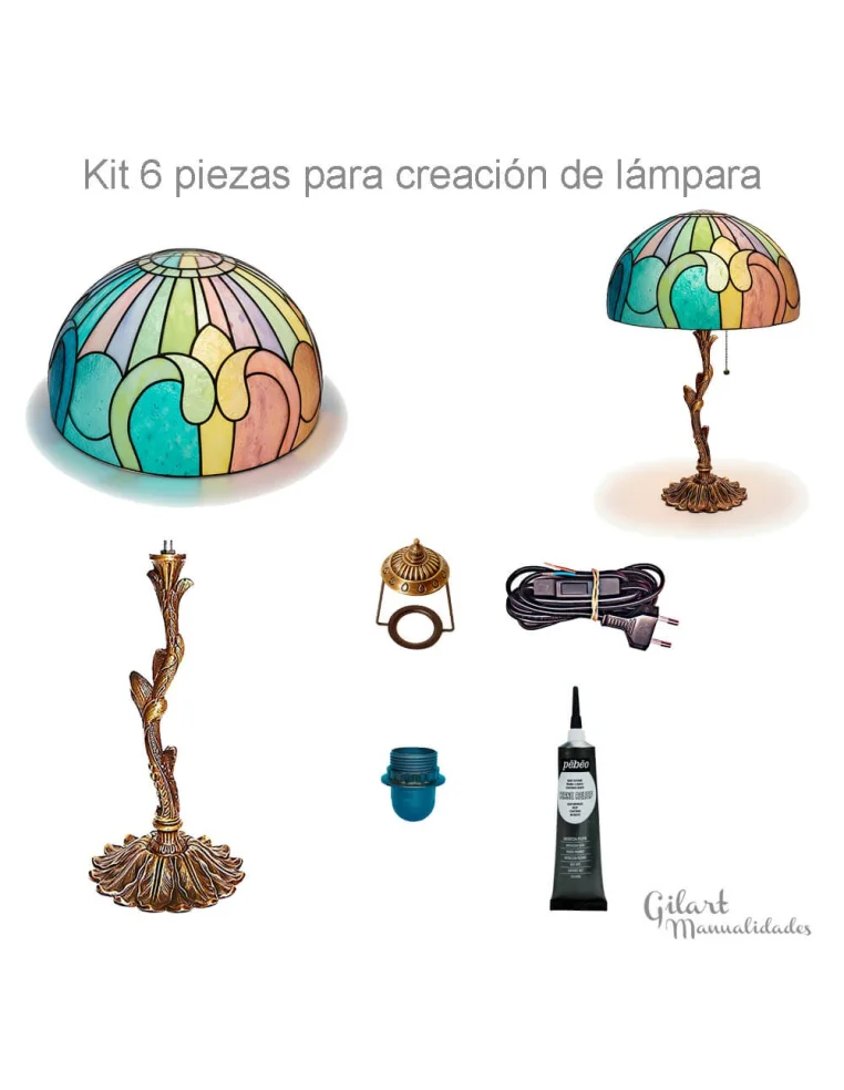 Este kit incluye todo lo necesario: la pantalla prediseñada de metacrilato (Ref. 10011), el pie de zamac (Ref. 10055), la lira (Ref. 10165), el portalámparas (Ref. 10074), el cable de alimentación (Ref. 10080) y un tubo de cerne de imitación plomo (Ref. 10139). Es compatible con pinturas para vidrio, resinas epoxi y outliners para personalizar completamente tu diseño.