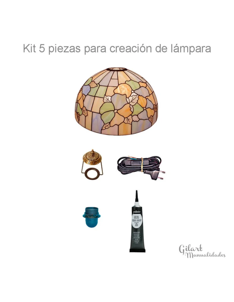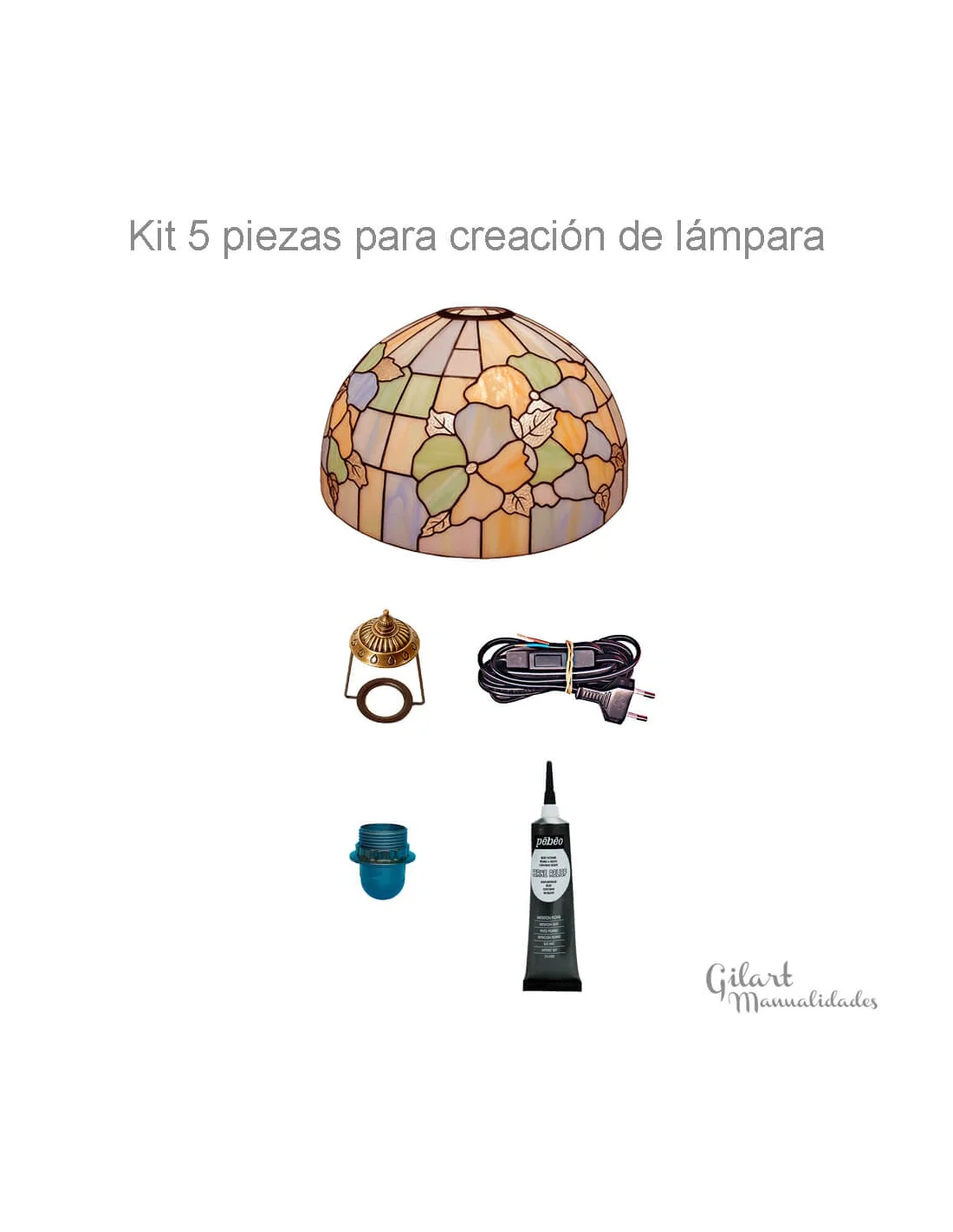 El kit incluye todos los componentes necesarios: la pantalla de metacrilato prediseñada "flor pensamientos" de 25 cm (Ref. 10014), una lira (Ref. 10165), el portalámparas (Ref. 10074), el cable de alimentación (Ref. 10080) y un tubo de Cerne Imitación plomo (Ref. 10139). Los materiales son de alta calidad para garantizar la durabilidad y un resultado espectacular. ¡Imagínate tu nueva lámpara iluminando con estilo tu rincón de lectura, tu dormitorio o tu salón!
