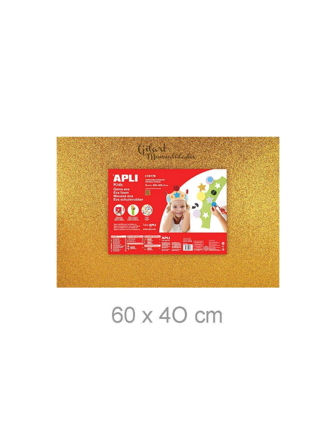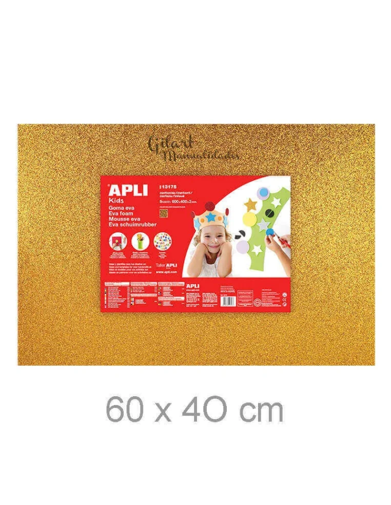 Goma EVA Purpurina Oro Apli 60x40 cm: Material flexible y brillante, ideal para proyectos de decoración elegante, disfraces temáticos y manualidades festivas. Fácil de cortar, pegar y moldear con acabado dorado que no se desprende. Añade un toque lujoso y sofisticado a tus creaciones con un brillo profesional y duradero que transforma cualquier pieza.