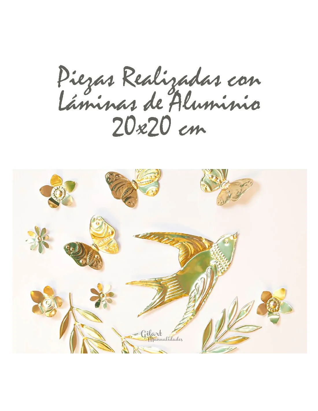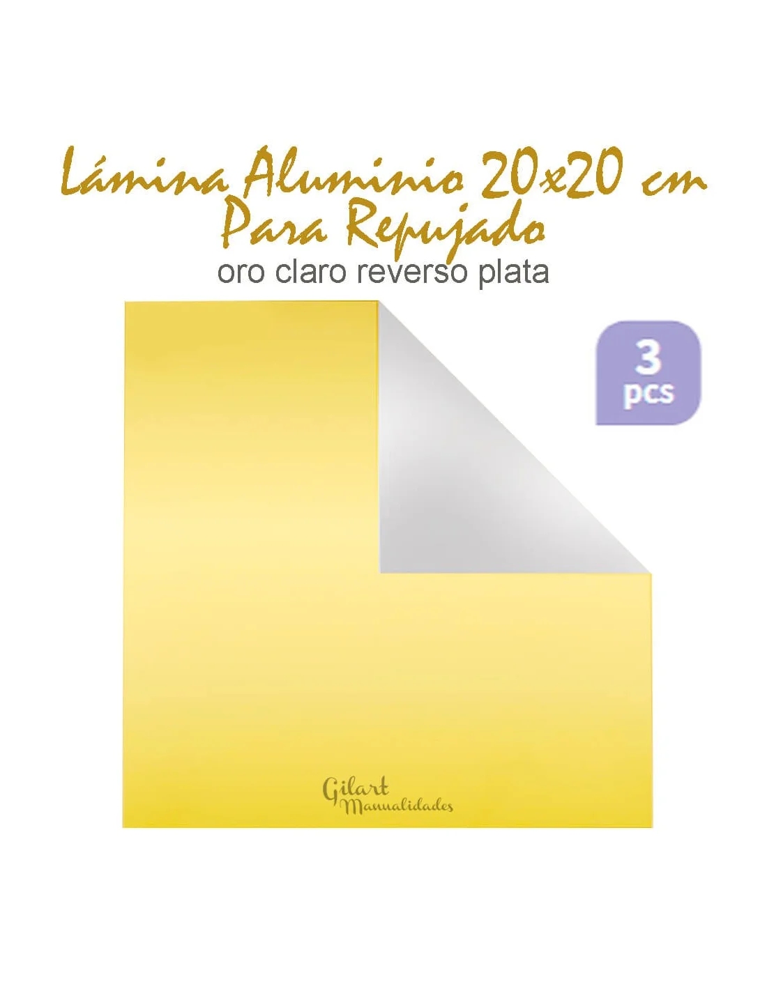 Pack de 3 láminas de aluminio de 20x20 cm de alta calidad, diseñadas especialmente para la técnica de repujado y manualidades de metalistería artística. Estas láminas cuentan con un acabado bicolor (oro por una cara y plata por la otra), ofreciendo versatilidad total en tus proyectos decorativos. La base perfecta para crear relieves detallados y texturas profesionales en Gilart.