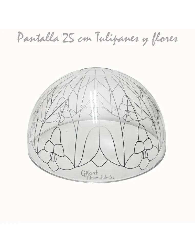 La Pantalla Lámpara Metacrilato 25 cm Tulipanes y Flores es la base ideal para crear una lámpara de imitación Tiffany con un diseño floral vibrante. Fabricada en metacrilato transparente de alta resistencia, permite reseguir sus líneas con plomo líquido o cinta de plomo adhesiva de forma sencilla. Tras aplicar la pintura para cristal, es fundamental dar una capa de barniz protector para asegurar la durabilidad del trabajo y realzar el brillo de los pétalos. Compatible con bombillas LED, esta pantalla proyecta una luz artística que aporta elegancia y un toque artesanal a cualquier estancia. 💡