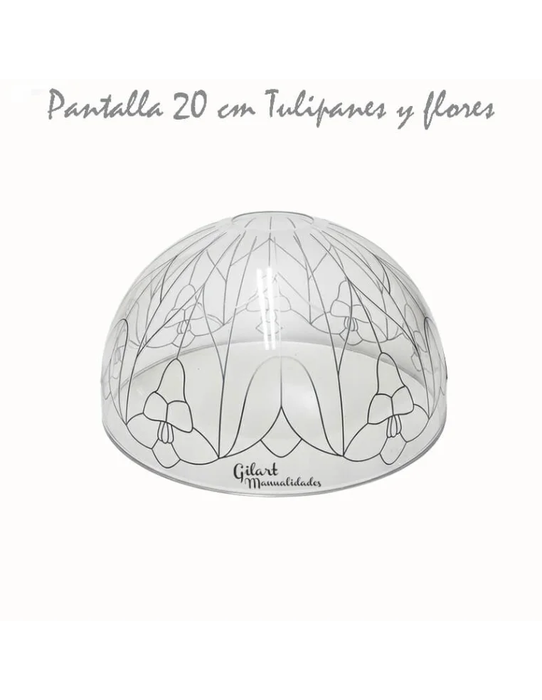 Crea tu propia lámpara de tulipanes con estilo imitación Tiffany. Resigue el dibujo con plomo líquido y aplica pintura para cristal sobre esta pantalla de metacrilato de 20 cm. Ideal para proyectos de iluminación artesanal llenos de color y elegancia para decorar cualquier estancia de forma personalizada.