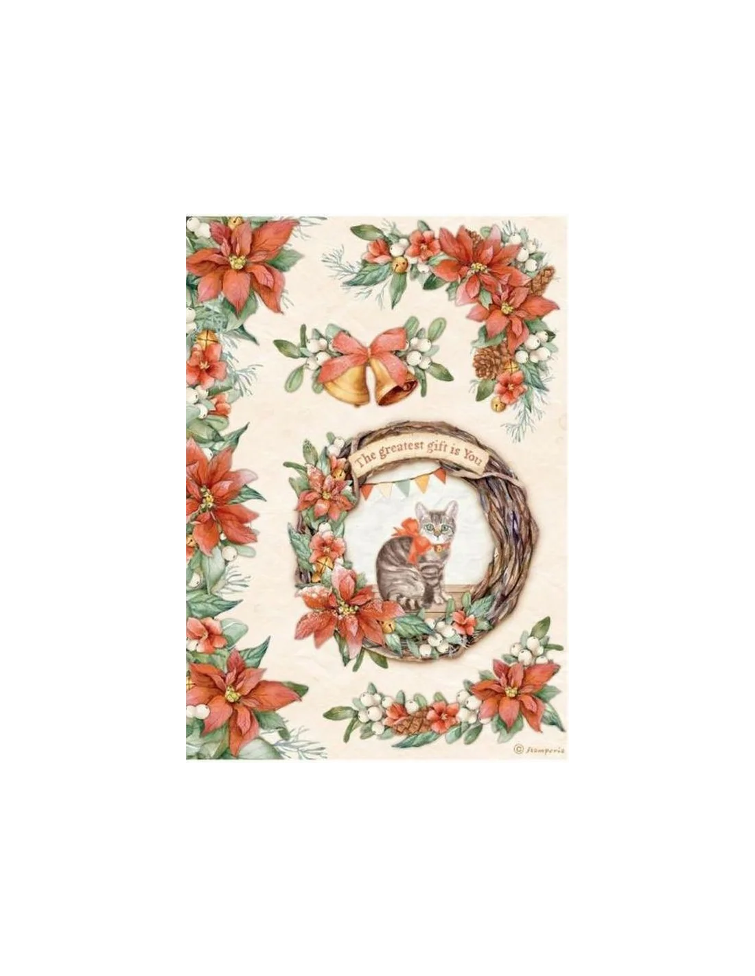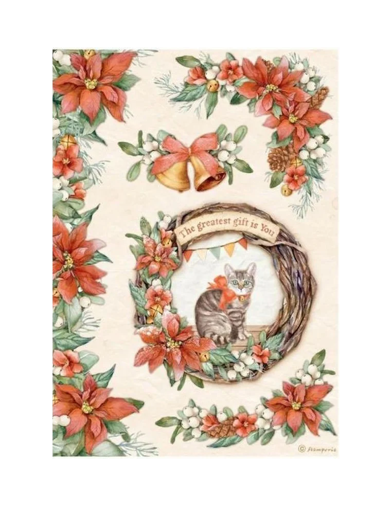 Papel arroz A4 Stamperia All Around Christmas corona con gato DFSA4803, perfecto para decoupage navideño sobre madera, cartón o cristal. Diseño tierno con gato y elementos festivos que aporta calidez a tus creaciones. Crea adornos únicos y personalizados estas fiestas con estilo acogedor.