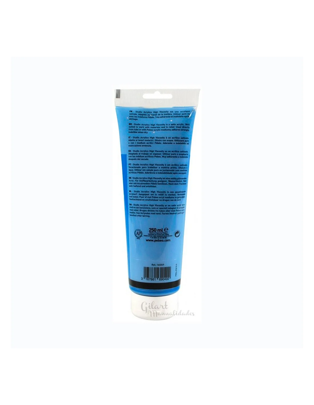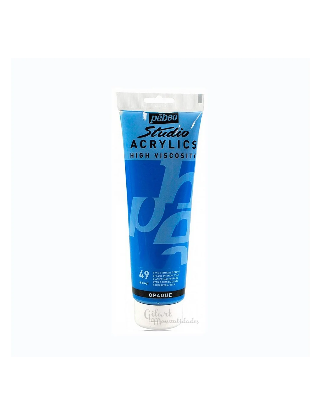 Pintura acrílica Pébéo Studio 250 ml Azul Cyan Primario 49 con color intenso y brillante. Ideal para mezclas precisas y degradados equilibrados. Incorpórala a tu paleta y potencia tus creaciones artísticas.