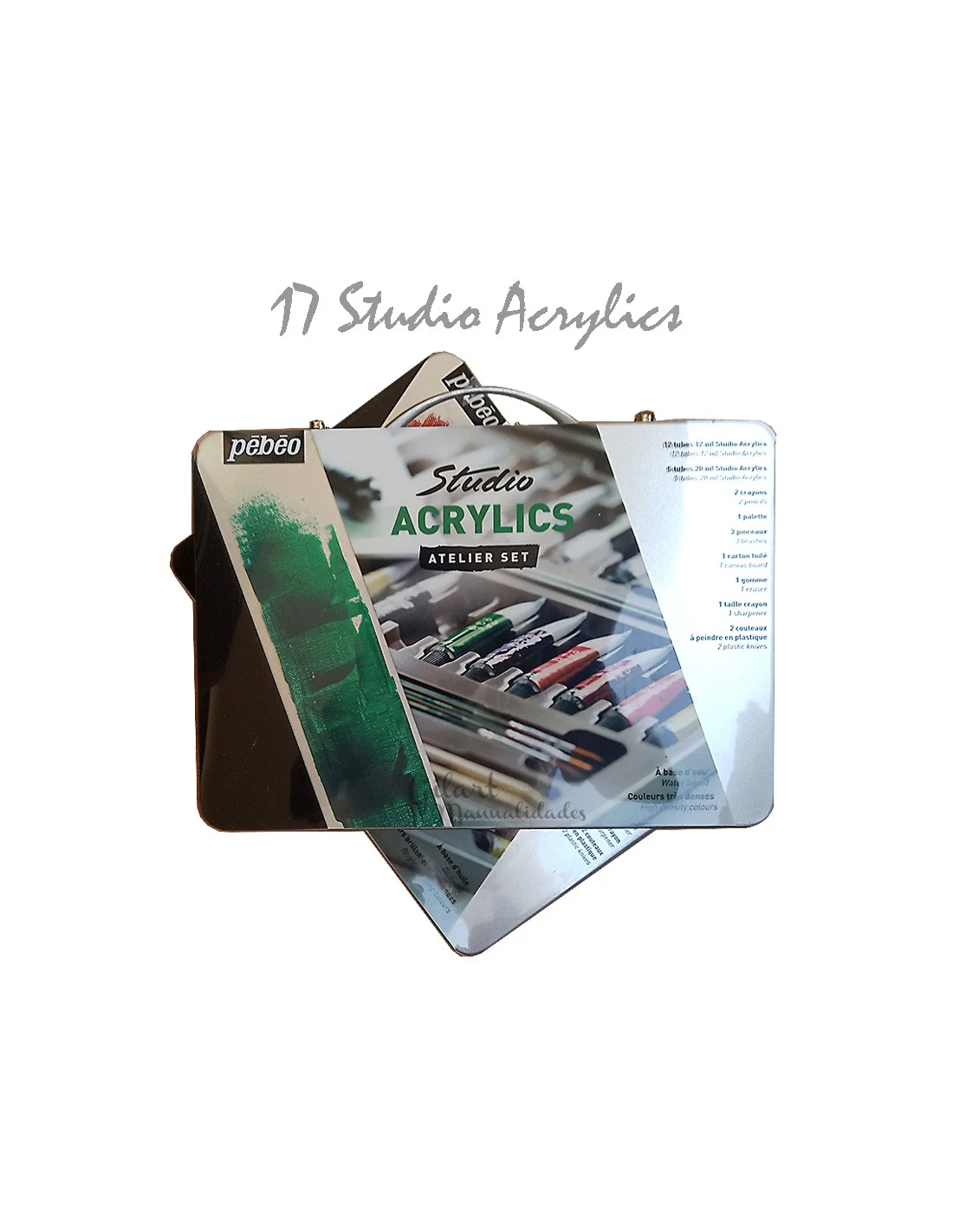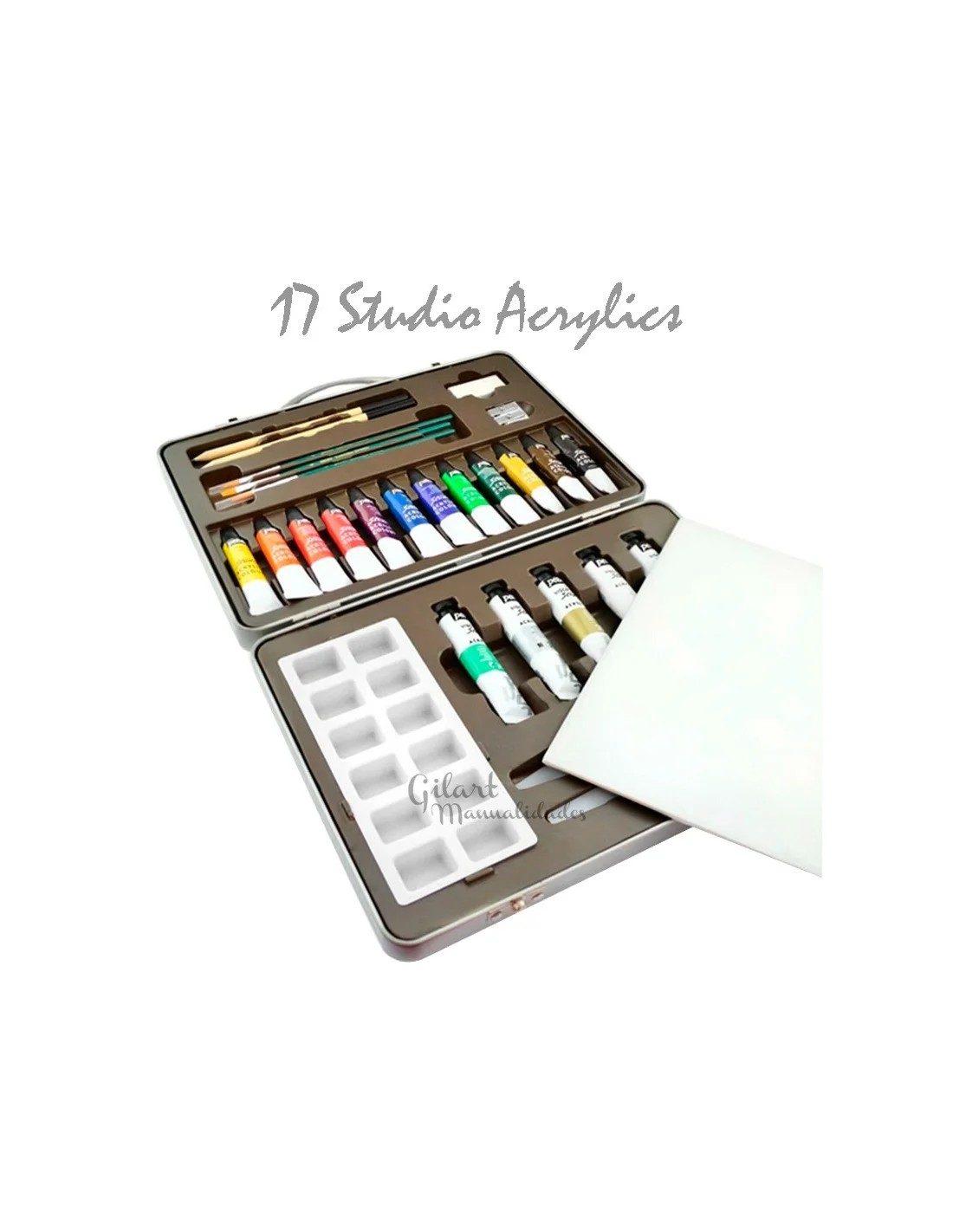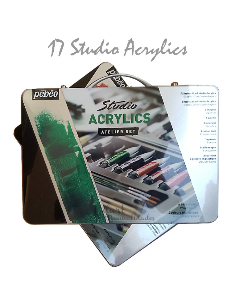 Maletín Pebeo Studio con 17 acrílicos profesionales y accesorios. 12 tubos de 12 ml y 5 de 20 ml con colores intensos y mezclables. Incluye pinceles, espátulas, paleta y cartón entelado en estuche resistente para artistas.