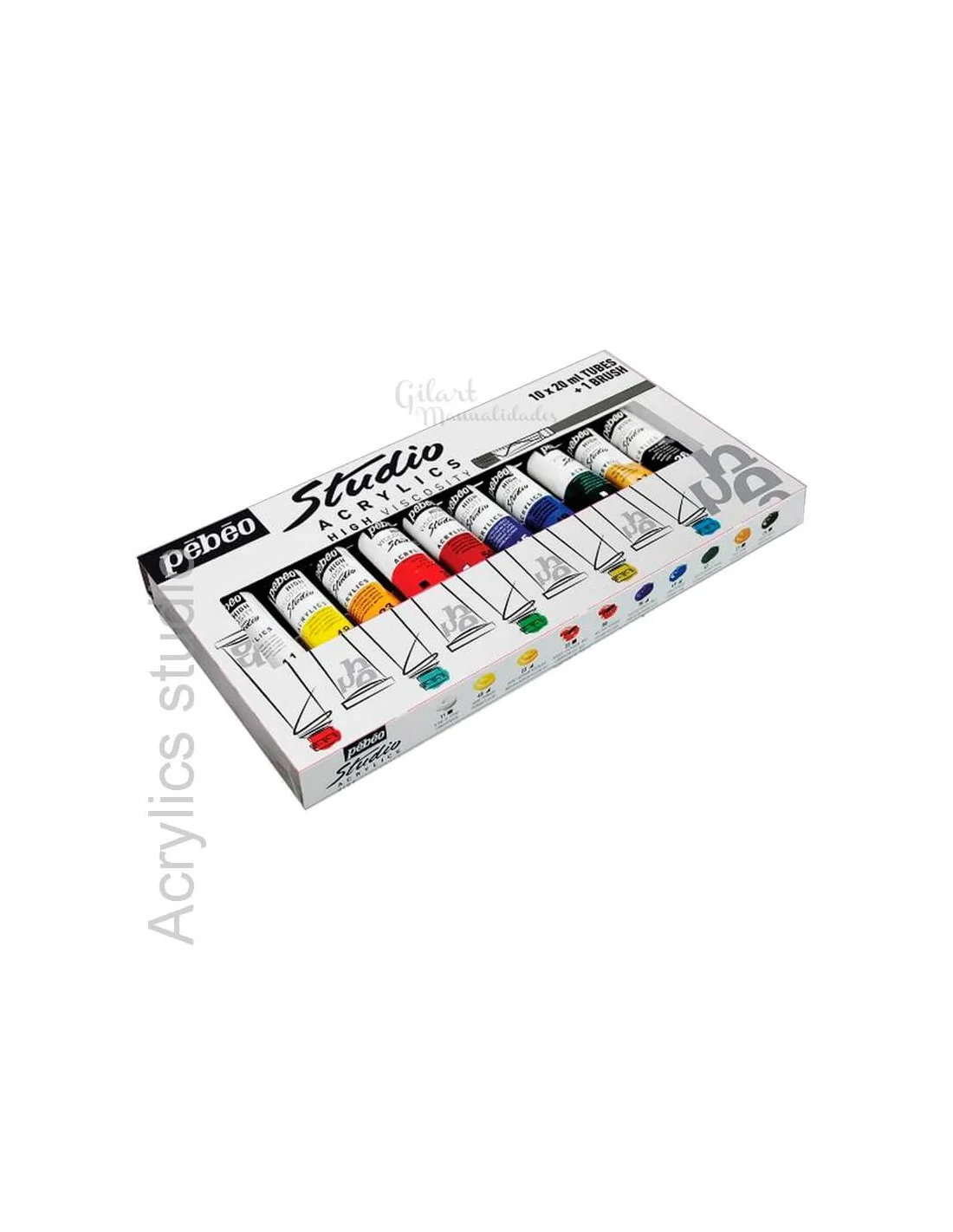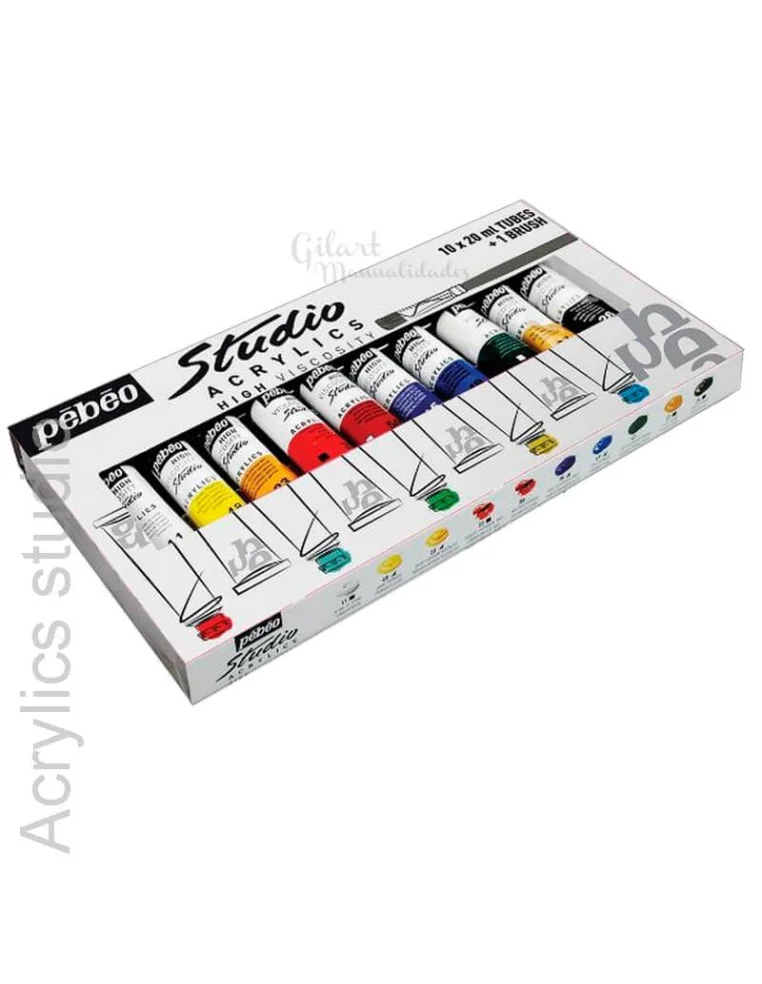 10 Tubos Pintura Acrílica Pebeo + Pincel - Set Estudio 20 ml