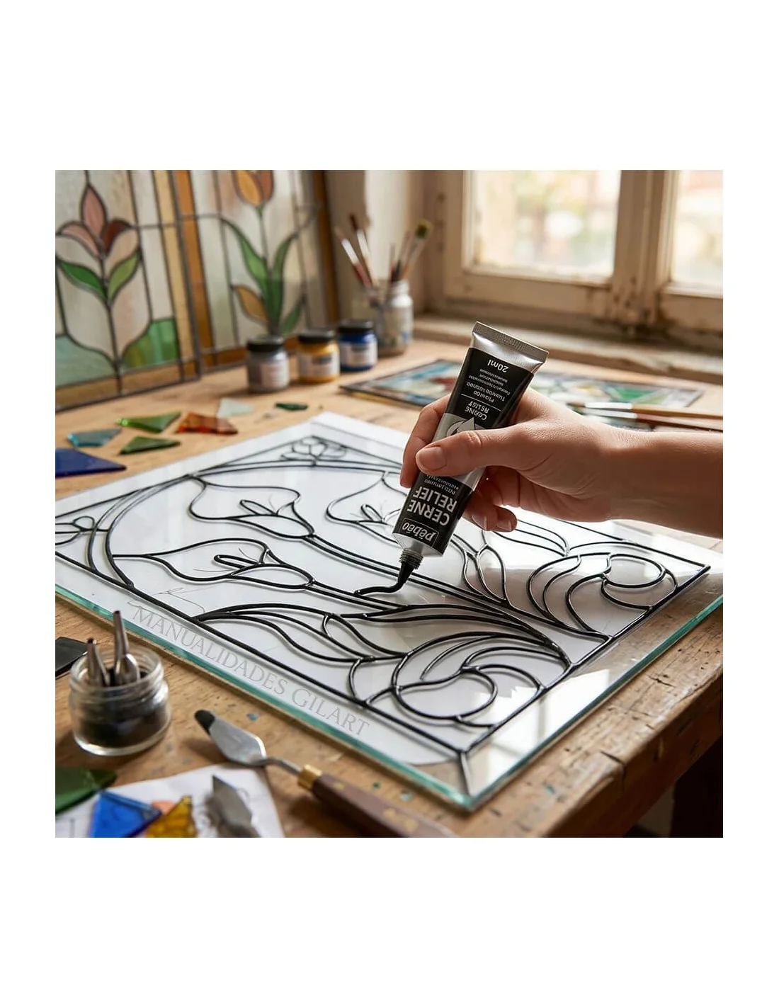 Su uso es sumamente intuitivo gracias al diseño del tubo con cánula aplicadora. Para obtener resultados óptimos, se debe aplicar directamente sobre la superficie limpia y desengrasada, ejerciendo una presión constante para lograr líneas uniformes. Es el complemento perfecto para las gamas de pintura Vitrail y Vitrea 160 de Pebeo, permitiendo crear estructuras detalladas antes de rellenar los compartimentos con colores vibrantes o resinas transparentes.