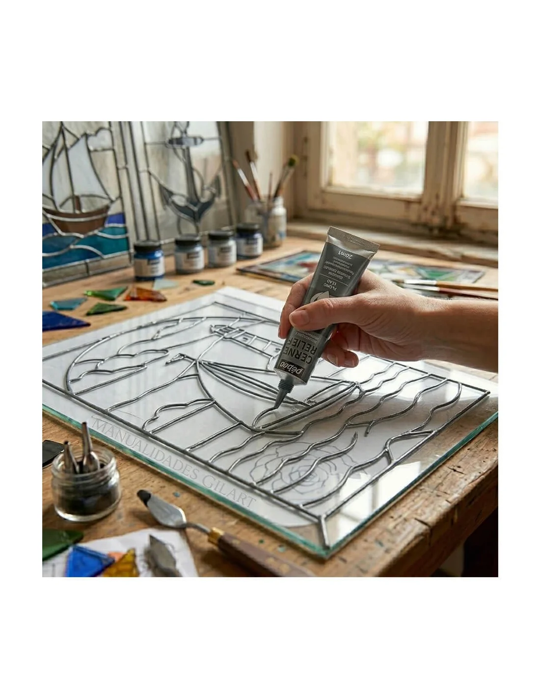 Su uso es sumamente intuitivo gracias al diseño del tubo con cánula aplicadora. Para obtener resultados óptimos, se debe aplicar directamente sobre la superficie limpia y desengrasada, ejerciendo una presión constante para lograr líneas uniformes. Es el complemento perfecto para las gamas de pintura Vitrail y Vitrea 160 de Pebeo, permitiendo crear estructuras detalladas antes de rellenar los compartimentos con colores vibrantes o resinas transparentes.