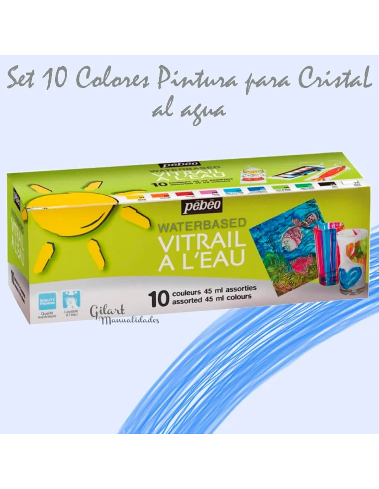 Set de 10 pinturas para cristal Vitrail Pebeo de 45 ml a base de agua. Colores transparentes de acabado brillante para decorar vidrio, plástico y metal sin necesidad de horno. Su fórmula segura es ideal tanto para artistas como para uso escolar a partir de 3 años. Crea efectos de vidriera profesionales de forma sencilla y limpia.