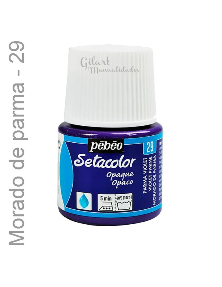 Pintura para tela Setacolor Opaco en color Morado de Parma n.º 29. Su fórmula concentrada de base acuosa ofrece una excelente resistencia a la luz y cobertura total en tejidos claros y oscuros. Su textura rica permite aplicaciones homogéneas con pincel o estarcido, manteniendo la flexibilidad tras el fijado con plancha o en horno doméstico. Ideal para algodón, lino y mezclas.