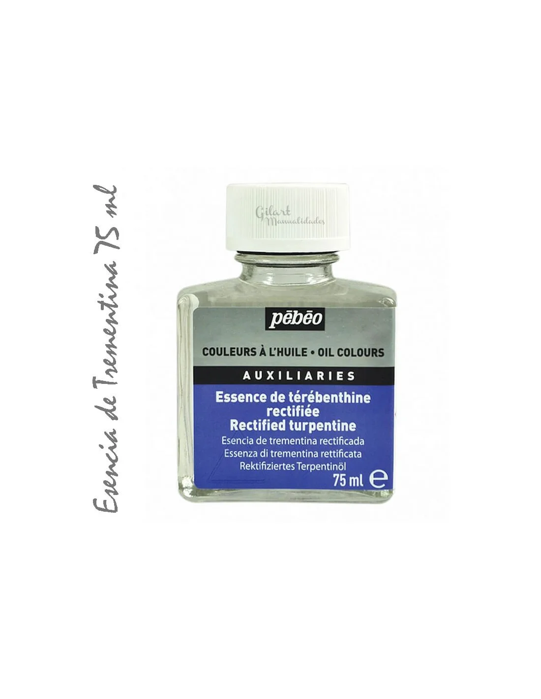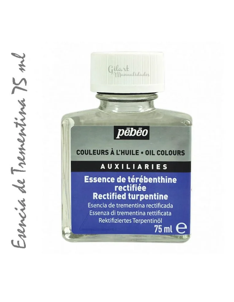 NUEVO NOMBRE (Máx. 850 caracteres) Esencia de Trementina Rectificada Pebeo 75 ml: Disolvente esencial para óleo y bellas artes, ideal para artistas profesionales y aficionados que buscan pureza y resultados impecables. Esta trementina se obtiene por destilación de resina de pino y destaca por su alta calidad rectificada, lo que asegura que no deja residuos grasos ni se resinifica, permitiendo una mezcla de colores más limpia y un acabado uniforme en tus obras de arte.
