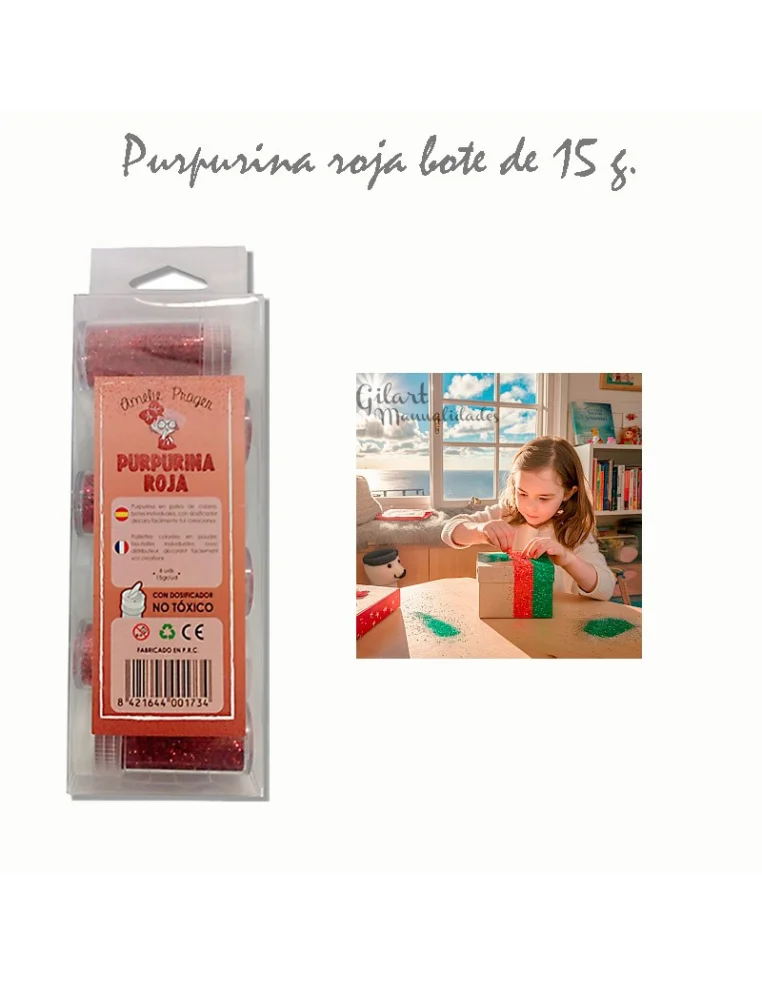 Purpurina roja Amelie 15g no tóxica. Brillo intenso y apasionado para proyectos creativos con dosificador preciso y aplicación segura para todas las edades. Añade energía y vitalidad a tus manualidades con un acabado profesional duradero que realza cada detalle con un toque festivo y vibrante.