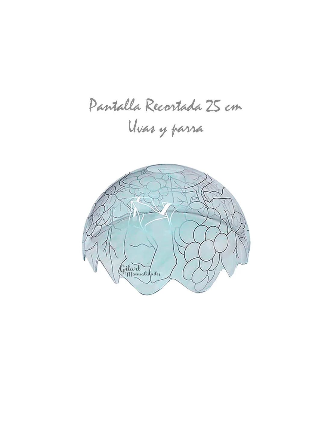 Pantalla de lámpara de metacrilato de 25 cm con diseño de Uvas y Parra, ideal para crear tu propio vitral artístico estilo Tiffany. Esta pieza recortada y transparente te permite pintar y decorar con plomo líquido y pinturas para cristal, logrando una pieza única de iluminación para tu hogar.