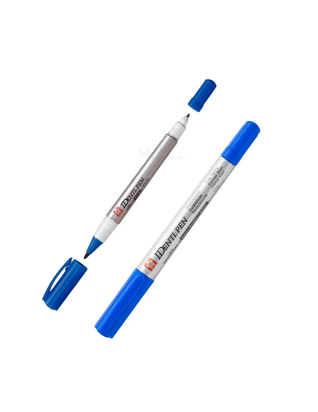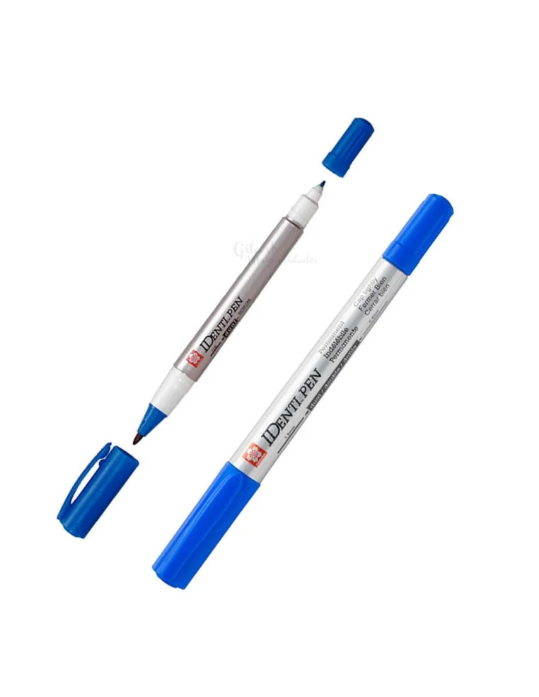 Rotulador permanente Sakura Identi-pen azul con doble punta de fibra y plástico. Su tinta de secado rápido y bajo olor es resistente al agua, ideal para marcar con precisión superficies no porosas como metal, vidrio, herramientas y plásticos. Una solución duradera y versátil para tus proyectos de etiquetado y dibujo profesional.