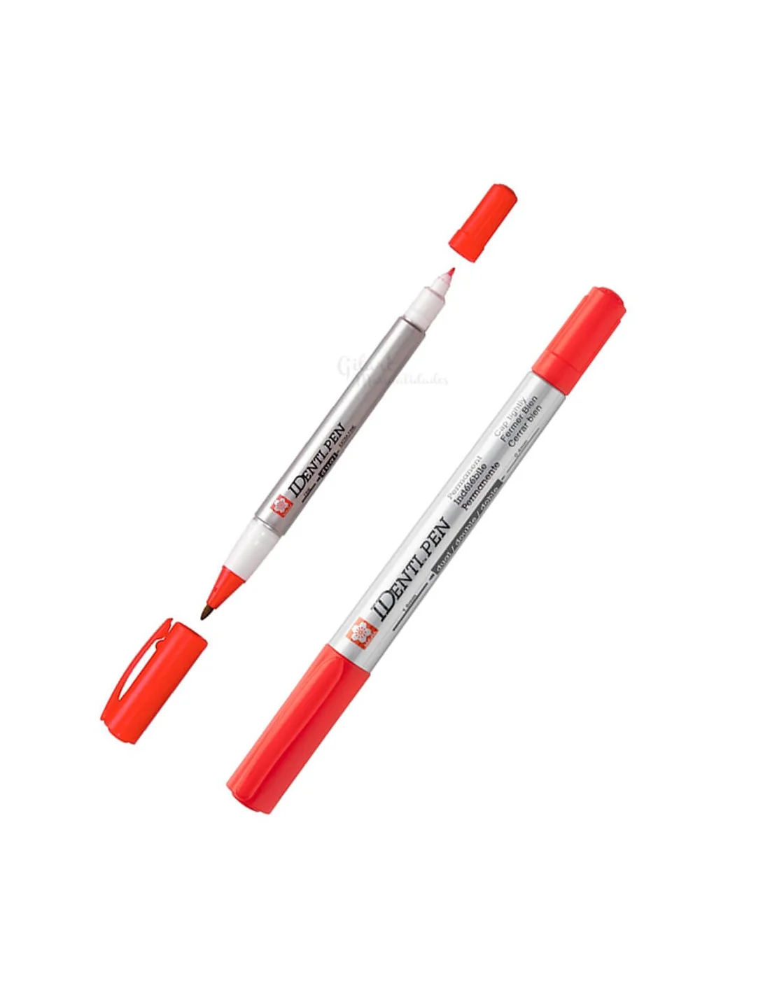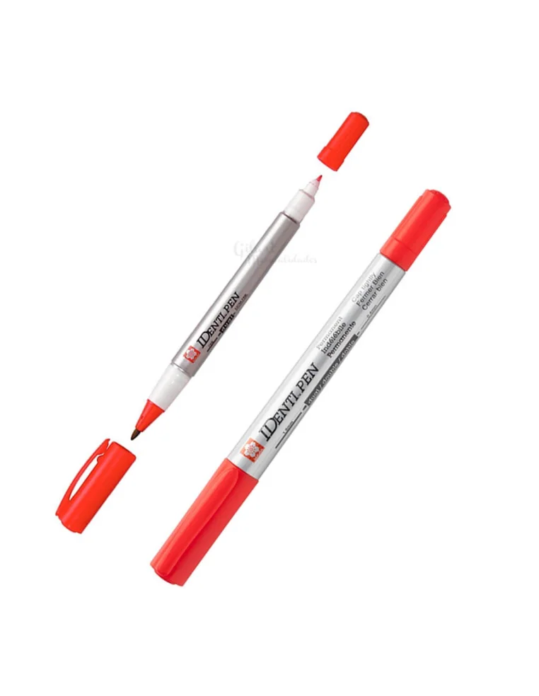 Rotulador permanente Sakura Identi-pen rojo con doble punta para trazos finos y definidos. Ideal para marcar, escribir y detallar sobre papel y superficies no porosas con secado rápido y alta resistencia. Precisión y fiabilidad en cada uso.