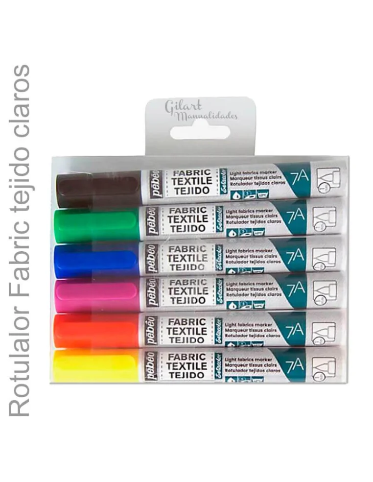 Rotuladores Textiles Pebeo Setacolor para Tejidos Claros - Set de 6 Colores. Tinta a base de agua, vibrante y permanente, ideal para personalizar algodón, lino y fibras claras sin necesidad de fijación térmica. Perfectos para tus ideas de arte textil y manualidades sobre camisetas o accesorios. ¡Comienza a crear diseños únicos y duraderos en tu ropa!