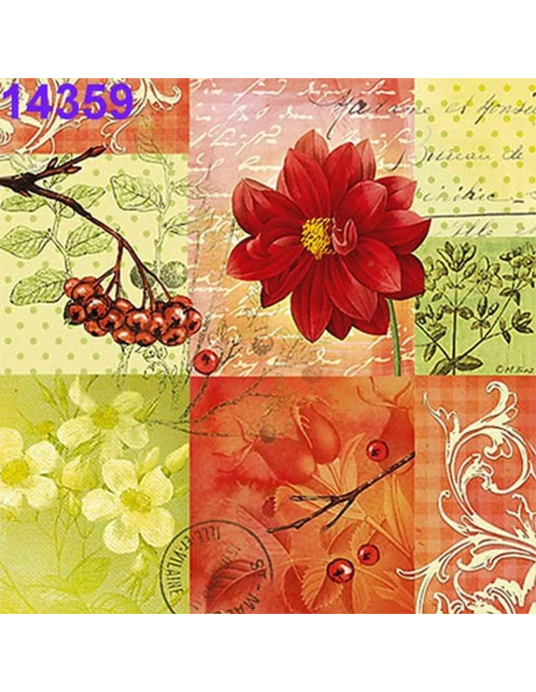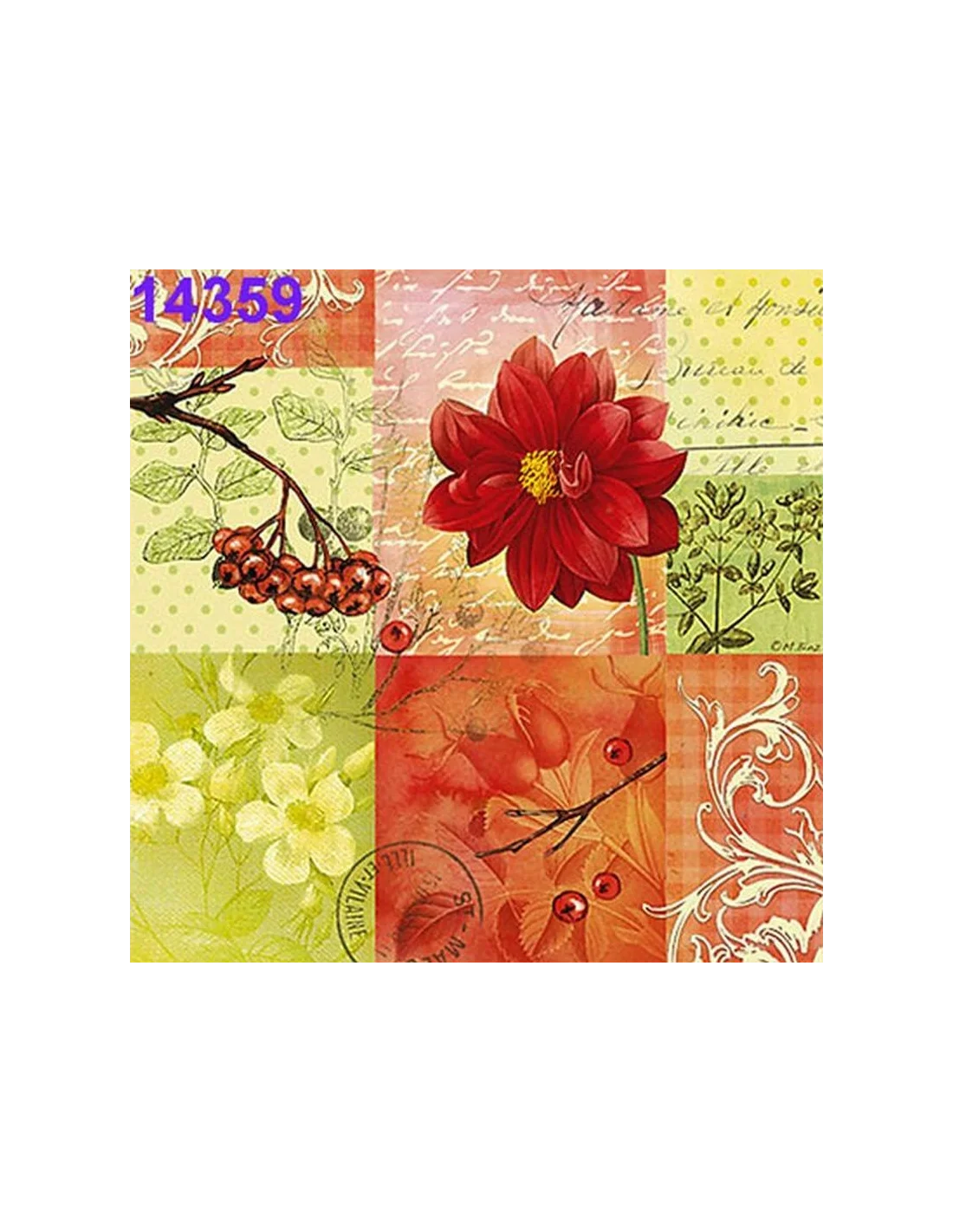 Servilletas Decoupage Manualidades Ambiente: Flores Cubistas 33x33 cm son el material imprescindible para elevar tus proyectos creativos de decoupage. Este set incluye 20 unidades de papel tricapa de alta calidad, fabricadas con tintas base agua y blanqueado sin cloro, lo que garantiza colores vibrantes (rojos, naranjas, verdes) y una adherencia excelente. Su diseño, con una composición de flores, frutos (bayas) y texturas tipo patchwork o cubista, es perfecto para añadir un aire vintage y artístico a cualquier superficie.