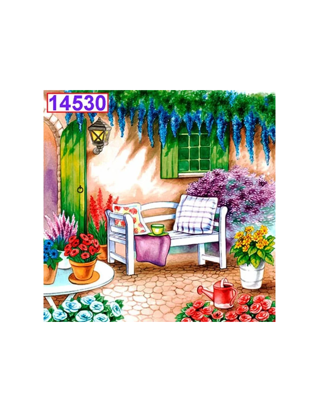 Servilletas Decoupage Ambiente: Patio 33x33 cm (20 Uds.). Este pack de servilletas de papel decoradas destaca por su encantador diseño de patio mediterráneo, ideal para proyectos de decoupage y decoración de superficies como madera, cristal, cartón o tela.