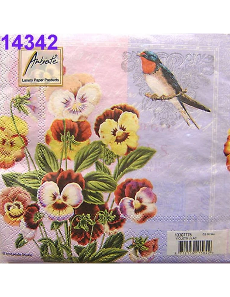 Servilletas Decoupage Ambiente: Pensamientos Jilguero 33x33 cm (20 Uds.) aportan un diseño delicado de flores y aves que realza tus proyectos de decoupage y decoración de mesas. Papel resistente compatible con barnices y pinturas acrílicas. Inspírate y crea belleza.