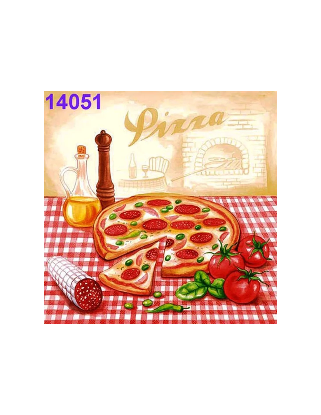 Servilletas Decoupage Pizza Salami Ambiente (33x33 cm, 20 Uds.). Papel premium con diseño divertido de pizza y salami, ideal para proyectos culinarios. Ideal para Decoupage en madera, cristal y metal. Perfectas para renovar utensilios de cocina o crear decoraciones para **fiestas temáticas italianas**. Aporta un toque festivo y un acabado profesional.