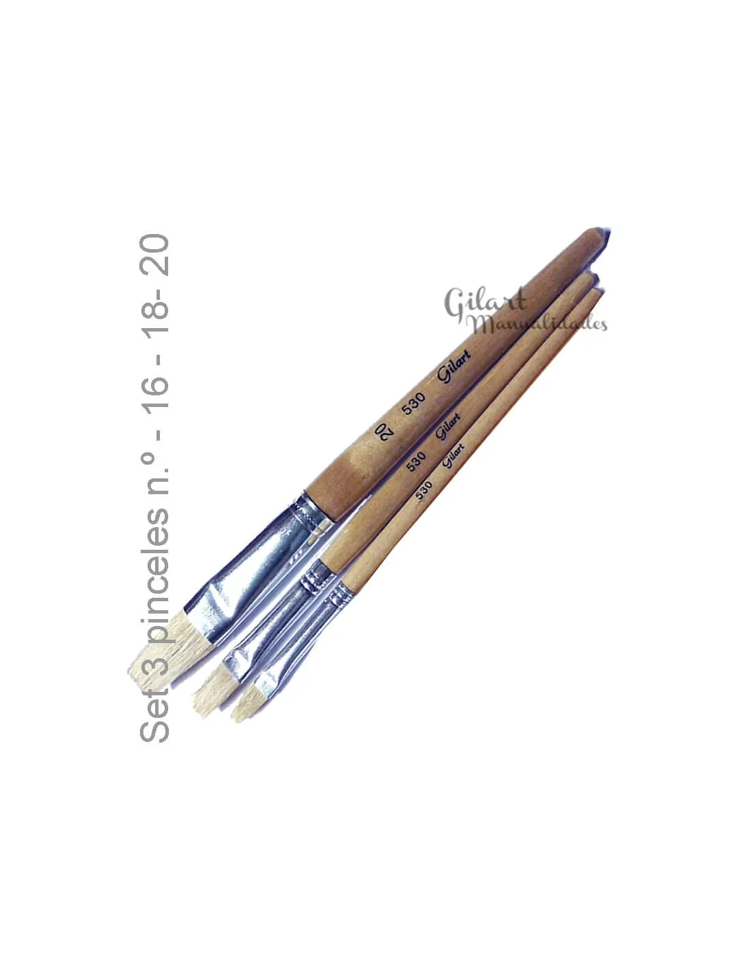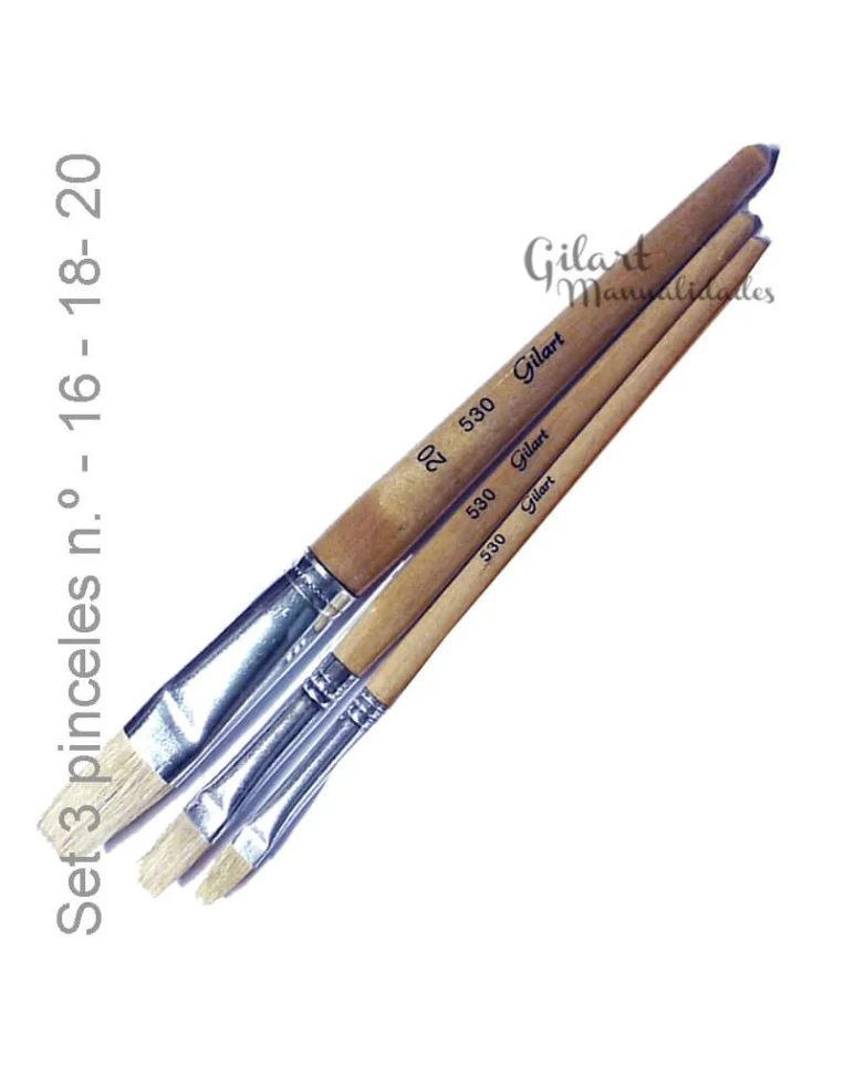 Kit 3 Pinceles Planos Cerda Natural Mango Corto Acrílico y Óleo Grandes | Gilart, serie 530. Incluye los tamaños n.º 16, 18 y 20, perfectos para aplicar capas amplias de color con precisión y fluidez. Las cerdas naturales garantizan una excelente carga de pintura y un acabado uniforme, ideales para óleo, acrílico o gouache. Su mango corto de madera barnizada ofrece un agarre cómodo y equilibrado, ideal para trabajar sobre lienzo, madera o papel. La virola metálica cromada asegura firmeza y durabilidad. Un set versátil para artistas, estudiantes o aficionados que buscan resultados profesionales. Crea sin límites con la calidad y fiabilidad de Gilart.