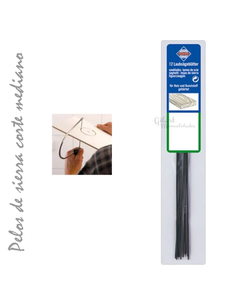 Pelos de Sierra Medianos kit 12 unidades: versatilidad y precisión para cortes en madera de densidad media. Ideal para proyectos de marquetería y ebanistería que requieren equilibrio entre detalle y eficiencia. Acabados limpios y duraderos para profesionales y aficionados. Eleva tus habilidades artesanales.