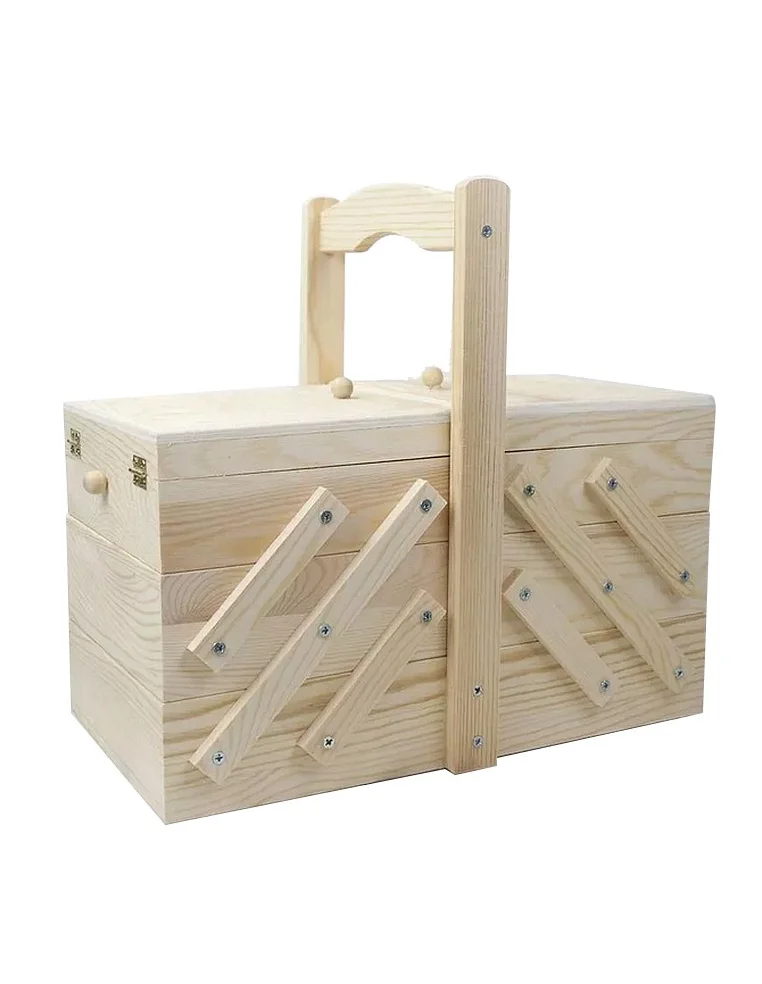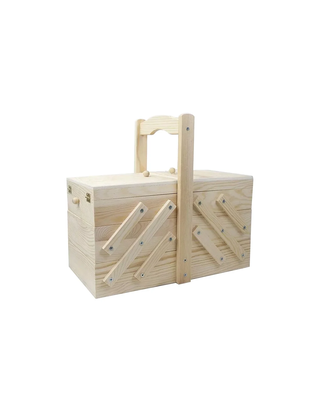 Descubre el encanto de nuestro costurero extensible con asa de madera natural (29x32x16 cm). Ideal para organizar tus accesorios de costura, esta caja es también un lienzo perfecto para dar rienda suelta a tu creatividad. Píntala, barnízala o decórala con la popular técnica de decoupage. Su diseño funcional y estética clásica lo convierten en el complemento ideal para tu espacio de trabajo o como un regalo pensado. Dale un toque personal con tu estilo único.