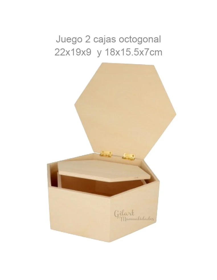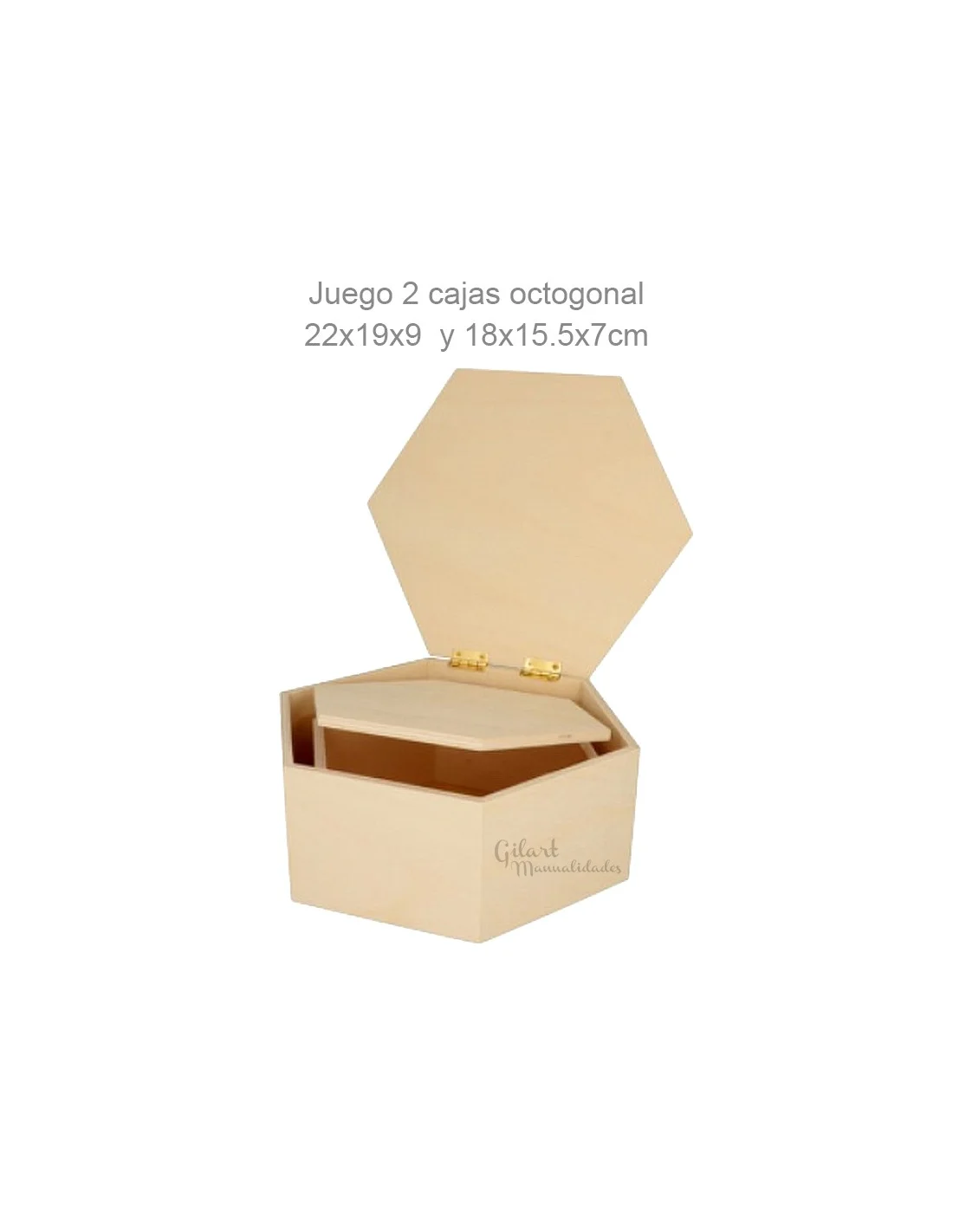 Descubre este original set de 2 cajas de madera natural con una distintiva forma hexagonal, listas para transformar en piezas únicas con tus propias manos. Ideales para manualidades, pintar, barnizar, o aplicar técnicas como decoupage, pirograbado o mixed media. El set incluye dos tamaños muy útiles: 22x19x9 cm y 18x15,5x7 cm, perfectos para empezar cualquier proyecto creativo con un toque diferente. Su superficie lisa y sin tratar es el lienzo en blanco que necesitas para dar rienda suelta a tu imaginación y personalizarlas a tu gusto con tus diseños favoritos, aprovechando su singular diseño hexagonal.