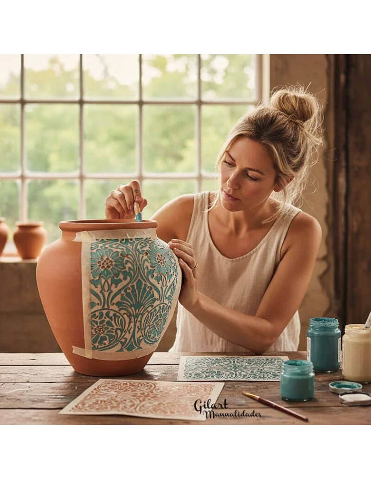 Stencil Plantilla Ornamento 21x15 cm. Añade un toque elegante a muebles, paredes o textiles con este diseño detallado. Fácil de usar con pintura, pasta o spray para crear patrones bellos y profesionales. Material reutilizable y duradero para muchos proyectos. Es la herramienta perfecta para decorar con estilo todos tus trabajos artísticos.