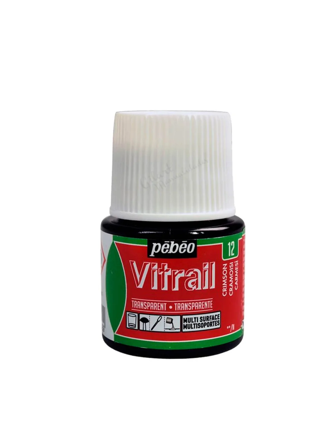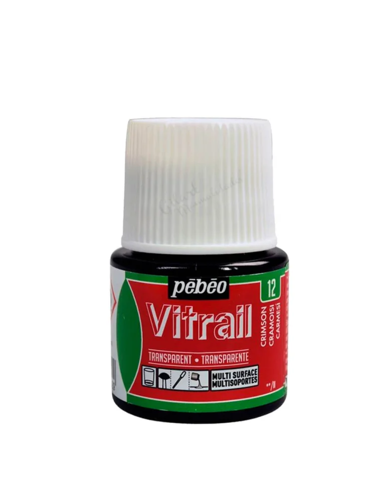 Pintura Vitrail de Pébéo en formato de 45 ml, diseñada para decorar superficies con un acabado transparente de cristal tintado. Su fórmula a base de disolvente garantiza colores vivos e intensos con un secado resistente. Es ideal para trabajar sobre vidrio, poliéster y acetato, logrando efectos de vidriera artística de alta calidad.