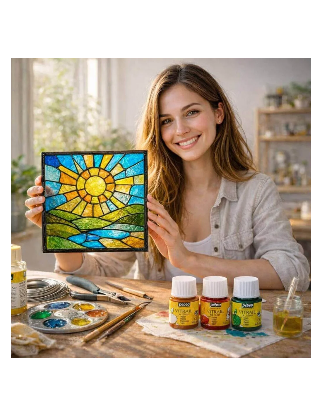 La satisfacción de trabajar con Pebeo Vitrail reside en ver cómo la luz atraviesa el color y transforma la atmósfera de cualquier estancia. Con este kit, podrás convertir objetos cotidianos en piezas de artesanía exclusivas con un acabado elegante y profesional. Es el momento de dar rienda suelta a tu talento y disfrutar del placer de crear con tus propias manos una decoración que refleje tu estilo personal. Recuerda limpiar siempre tus herramientas con aguarrás mineral o un limpiador específico para pinturas solventes. 🎨